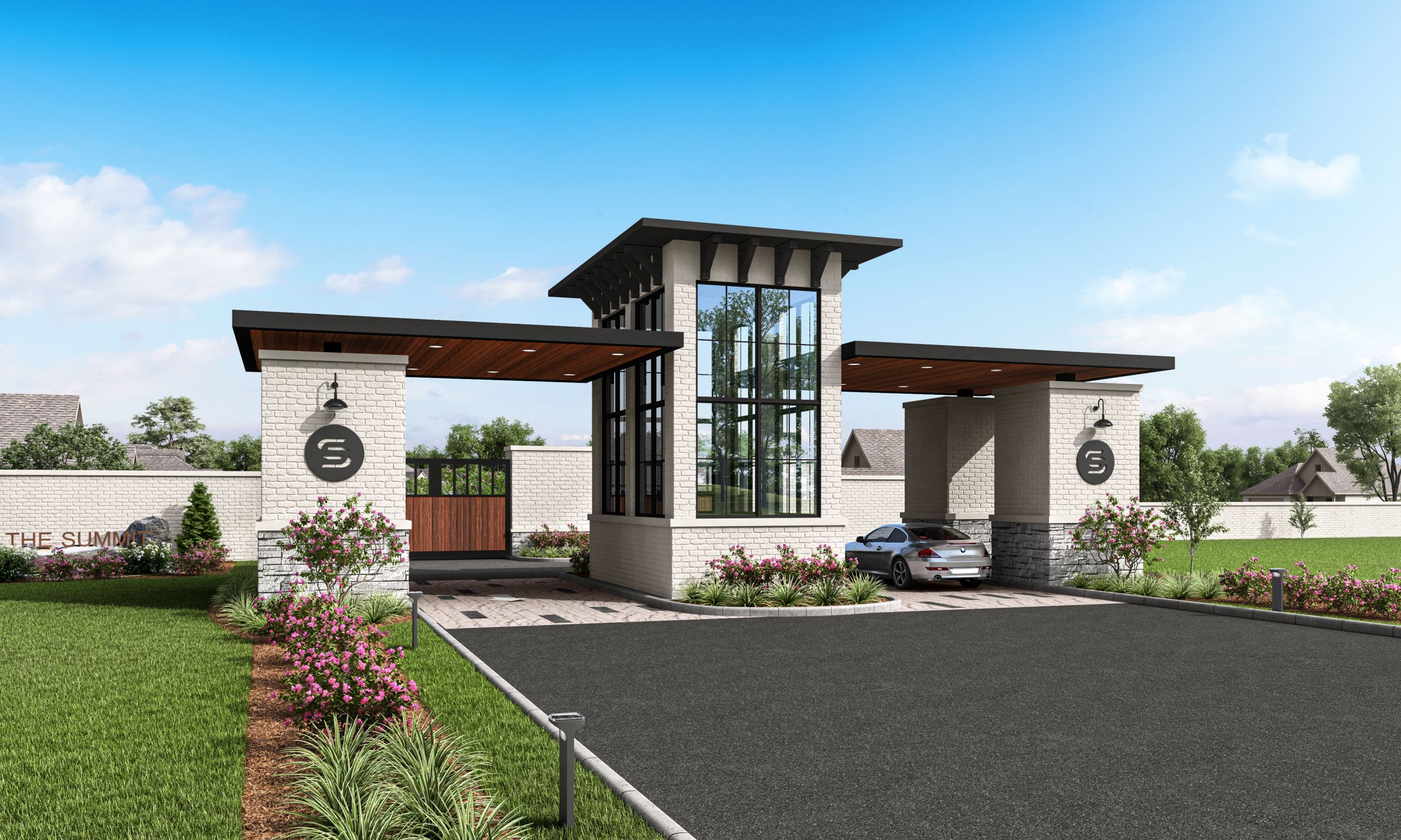 - Brick fence perimeter with gated entry controlled with app.